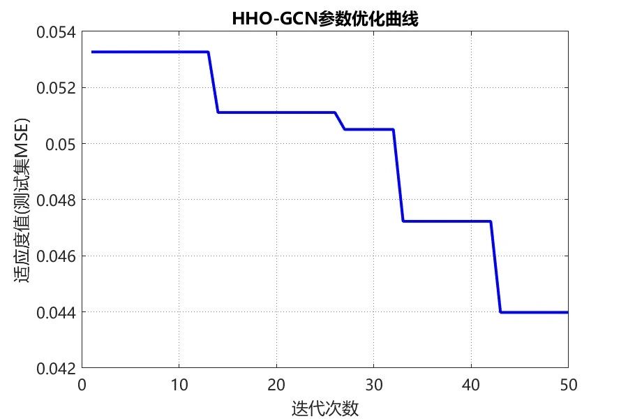 - 参数优化:将 GCN 的卷积核权重W^(l)、偏置b^(l)作为 HHO 的候选解,以 “回归预测误差最小化” 为目标函数,通过 HHO 寻找最优参数组合;