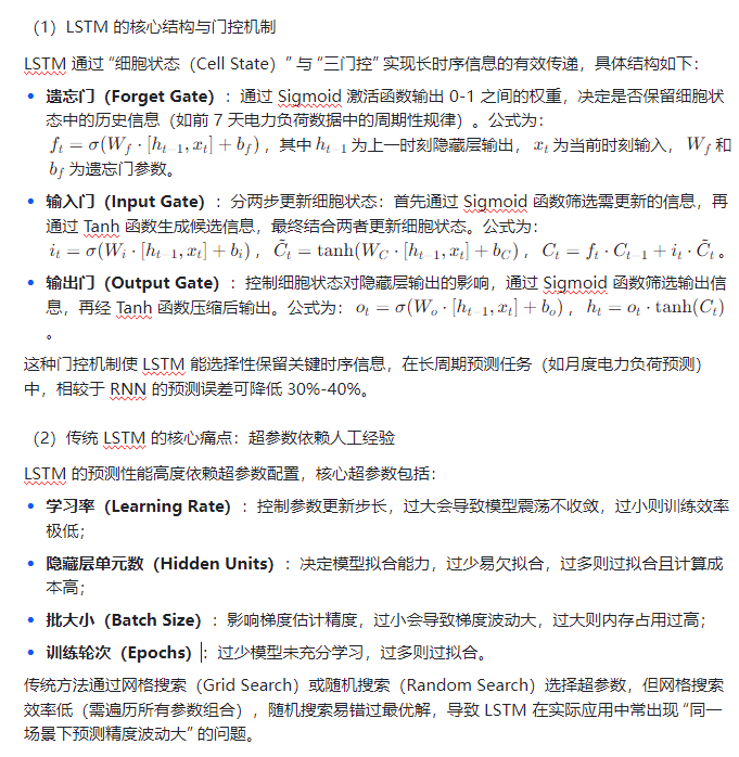 长短期记忆神经网络(LSTM)凭借门控机制(输入门、遗忘门、输出门)解决了传统 RNN 的 “梯度消失” 问题,能有效学习长周期时序依赖,成为当前时间序列预测的主流模型。但 LSTM 存在明显短板:模型超参数(如学习率、隐藏层单元数、批大小)的选择依赖人工经验,易陷入局部最优解,导致预测精度不稳定。