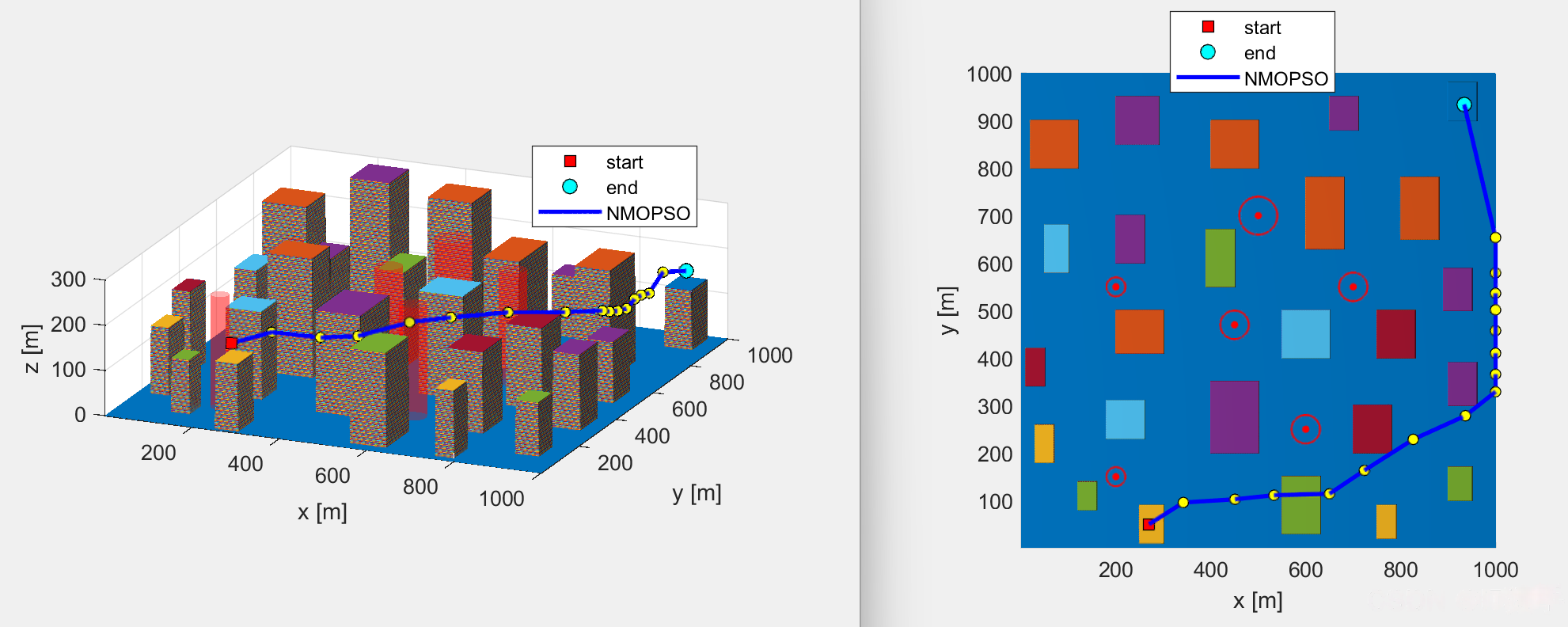 而导航变量多目标粒子群优化算法(NMOPSO)为解决这一难题提供了新的思路。它作为一种基于群体智能的优化算法,通过模拟鸟群觅食等群体行为,在搜索空间中进行高效搜索。该算法能够同时考虑多个目标,如路径长度、飞行安全性、能量消耗等,并在这些目标之间寻求最优平衡。在面对城市场景的复杂约束条件时,NMOPSO 算法展现出强大的适应性和优化能力,能够为无人机规划出更加合理、高效的三维飞行路径,从而提升无人机在城市场景中的应用效果,推动其在更多领域的深入应用。