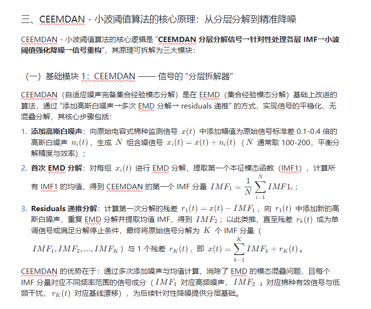 传统降噪方法如单一小波阈值去噪,虽能抑制部分高频噪声,但对与棉种信号频率重叠的低频干扰(如机械振动噪声)处理效果有限;而经验模态分解(EMD)虽可自适应分解非平稳信号,却存在 “模态混叠” 缺陷,难以精准分离棉种有效信号与噪声。自适应噪声完备集合经验模态分解(CEEMDAN)作为 EMD 系列算法的优化版本,能通过添加高斯白噪声实现信号的平稳化分解,有效解决模态混叠问题;将其与小波阈值的 “高频噪声抑制” 优势结合,构建CEEMDAN - 小波阈值联合降噪算法,可实现对电容式棉种监测信号的 “分层净化”,为棉花精准农业的数据分析提供高质量信号支撑。