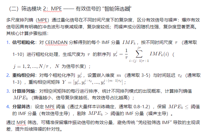 传统噪声抑制方法如单一小波阈值去噪(WTD),对与爆炸振动信号频率重叠的低频干扰处理效果有限;经验模态分解(EMD)去噪则存在 “模态混叠” 缺陷,难以精准分离有效信号与噪声。为此,本文提出CEEMDAN-MPE-IMPROVED WTD 联合算法:通过自适应噪声完备集合经验模态分解(CEEMDAN)实现信号分层,利用多尺度排列熵(MPE)量化各分量复杂度以筛选有效信号,结合改进小波阈值(IMPROVED WTD)强化噪声抑制,形成 “分解 - 筛选 - 降噪” 的全流程解决方案,为爆炸振动信号的精准分析提供高质量数据支撑。