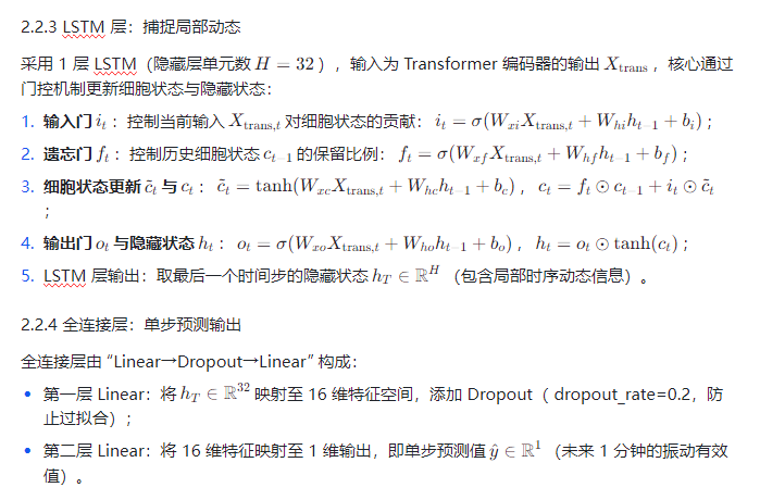| LSTM | 门控机制(输入门、遗忘门、输出门)擅长拟合局部时序动态(如振动的短期脉冲),对噪声更鲁棒 | 难以捕捉多变量间的长距离依赖(如 2 小时前的温度与当前振动的关联),并行计算效率低 |