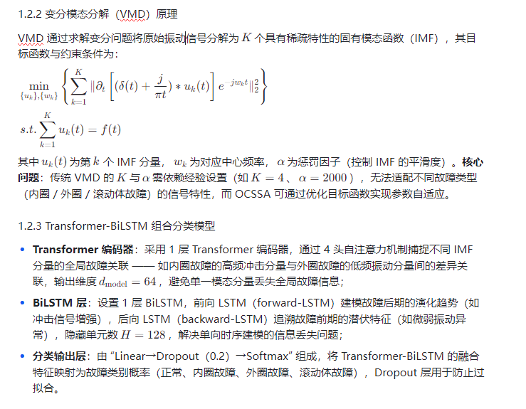 轴承作为旋转机械的核心部件,其故障诊断的及时性与准确性直接决定设备运行安全性。传统故障诊断方法存在 “特征提取依赖经验、单向时序建模丢失故障关联信息” 的瓶颈 —— 如 VMD 参数人工设置易导致模态混叠,单一 LSTM 难以捕捉故障前后的双向演化规律。本文提出 OCSSA-VMD-Transformer-BiLSTM 组合模型:通过改进型沙猫优化算法(OCSSA)自适应优化 VMD 的模态数