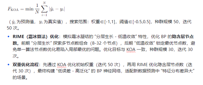 BP 神经网络的性能瓶颈集中在 “初始权重随机导致局部最优、隐含层节点数不当导致过 / 欠拟合”,KOA 与 RIME 的双重优化形成互补:
