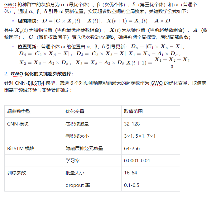灰狼优化算法(GWO)模拟灰狼群体的 “包围 - 追捕 - 攻击” 行为,通过种群迭代寻找全局最优解,其核心价值在于解决 CNN-BiLSTM 模型超参数手动调试的效率与精度痛点,具体设计如下: