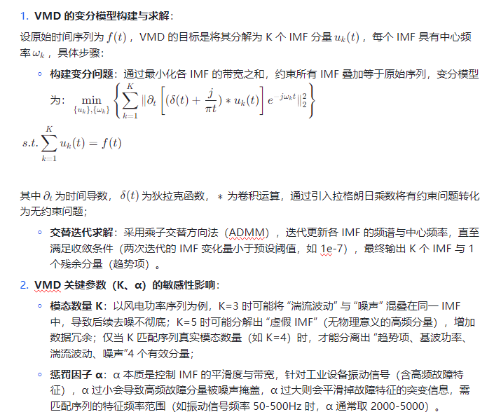 VMD 通过将时间序列分解为多个相互正交的固有模态函数(IMF),每个 IMF 对应序列的一个特征分量(如趋势、波动、噪声),其核心流程与参数影响如下: