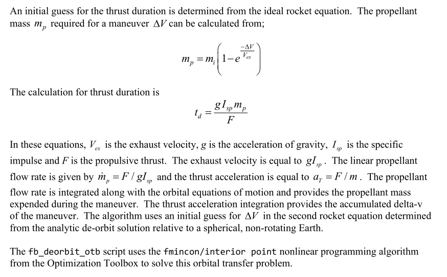推力作用时长的初始猜测值通过理想火箭方程确定。某一机动所需的推进剂质量可由以下公式计算: