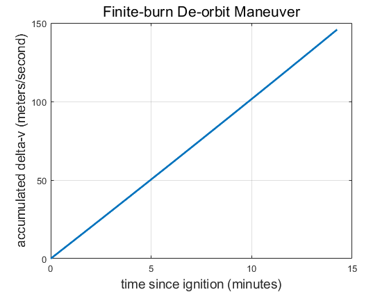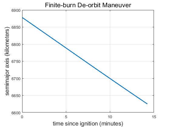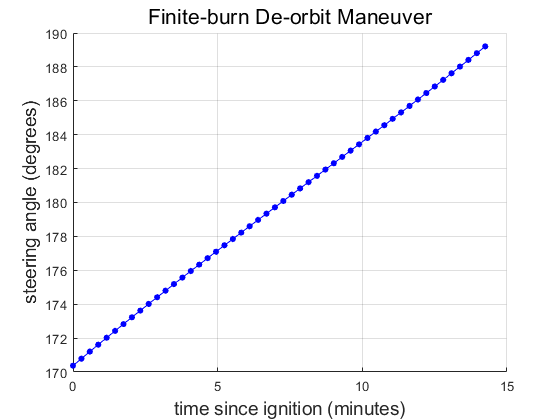 该脚本可用于计算航天器从初始圆轨道或椭圆地球轨道完成降轨所需的最优有限推力推进机动。仿真假设推进机动为连续、共面运动,并建模为一系列离散化的转向角。该脚本在满足用户定义的轨道边界条件的同时,力求最小化有限推力的作用时长。由于机动过程是连续的,因此这一目标等价于最小化机动所需的推进剂消耗量。