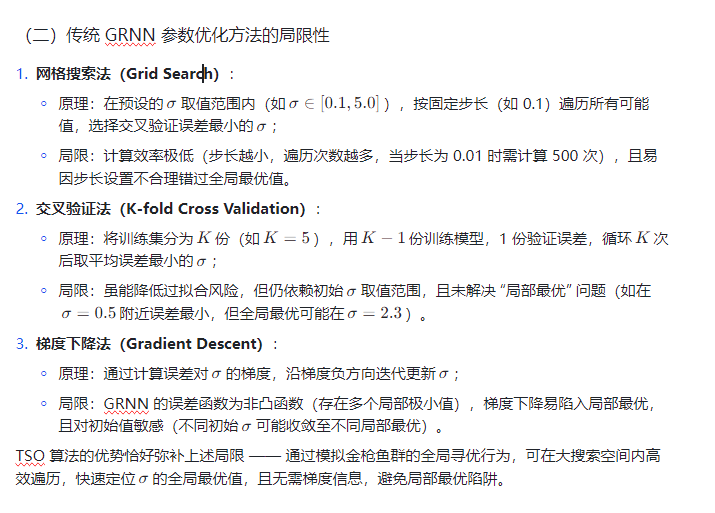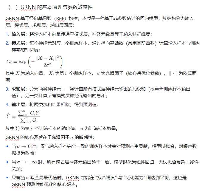 在时间序列预测(如电力负荷、空气质量、金融指数)、回归分析(如工业产品质量预测、环境因子关联分析)领域,广义回归神经网络(Generalized Regression Neural Network, GRNN) 凭借无需复杂迭代训练、非线性拟合能力强、泛化性能优的特性,成为常用预测工具。然而,GRNN 的预测精度高度依赖光滑因子(Spread) 这一核心参数 —— 光滑因子过小会导致模型过拟合(训练误差小但泛化误差大),过大则会使模型欠拟合(无法捕捉数据非线性特征)。传统参数优化方法(如网格搜索、交叉验证)存在计算效率低、易陷入局部最优的局限,难以找到全局最优光滑因子。
