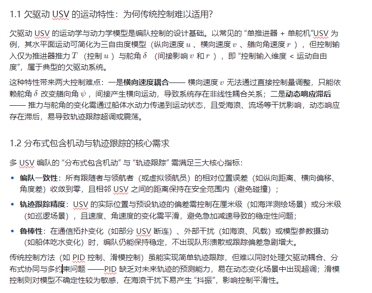 在海洋工程、环境监测、搜救救援等领域,单艘无人水面艇(USV)的作业范围、效率和抗风险能力有限,而多 USV 编队通过协同作业,可实现大范围海域巡逻、同步环境采样、联合搜救等复杂任务,成为海洋无人系统的重要发展方向。其中,“分布式包含机动”(即部分 USV 作为跟随者,在指定区域内围绕领航者形成稳定编队)与 “高精度轨迹跟踪”(所有 USV 精准跟随预设路径)是编队控制的核心需求,尤其在港口调度、海洋测绘等场景中,对控制精度和稳定性的要求更为严苛。
