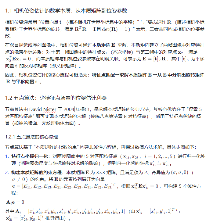 传统相机位姿估计方法中,五点算法(five-point algorithm) 因仅需 5 对匹配特征点即可求解本质矩阵,进而恢复相机位姿,在特征点数量有限或场景纹理稀疏的场景中具有显著优势。然而,五点算法的求解过程依赖于对本质矩阵的非线性优化,易受特征点匹配误差、图像噪声(如光照变化导致的灰度扰动)、镜头畸变等因素影响,导致估计出的相机位姿存在偏差,甚至出现 “位姿漂移”,难以满足高精度场景需求。