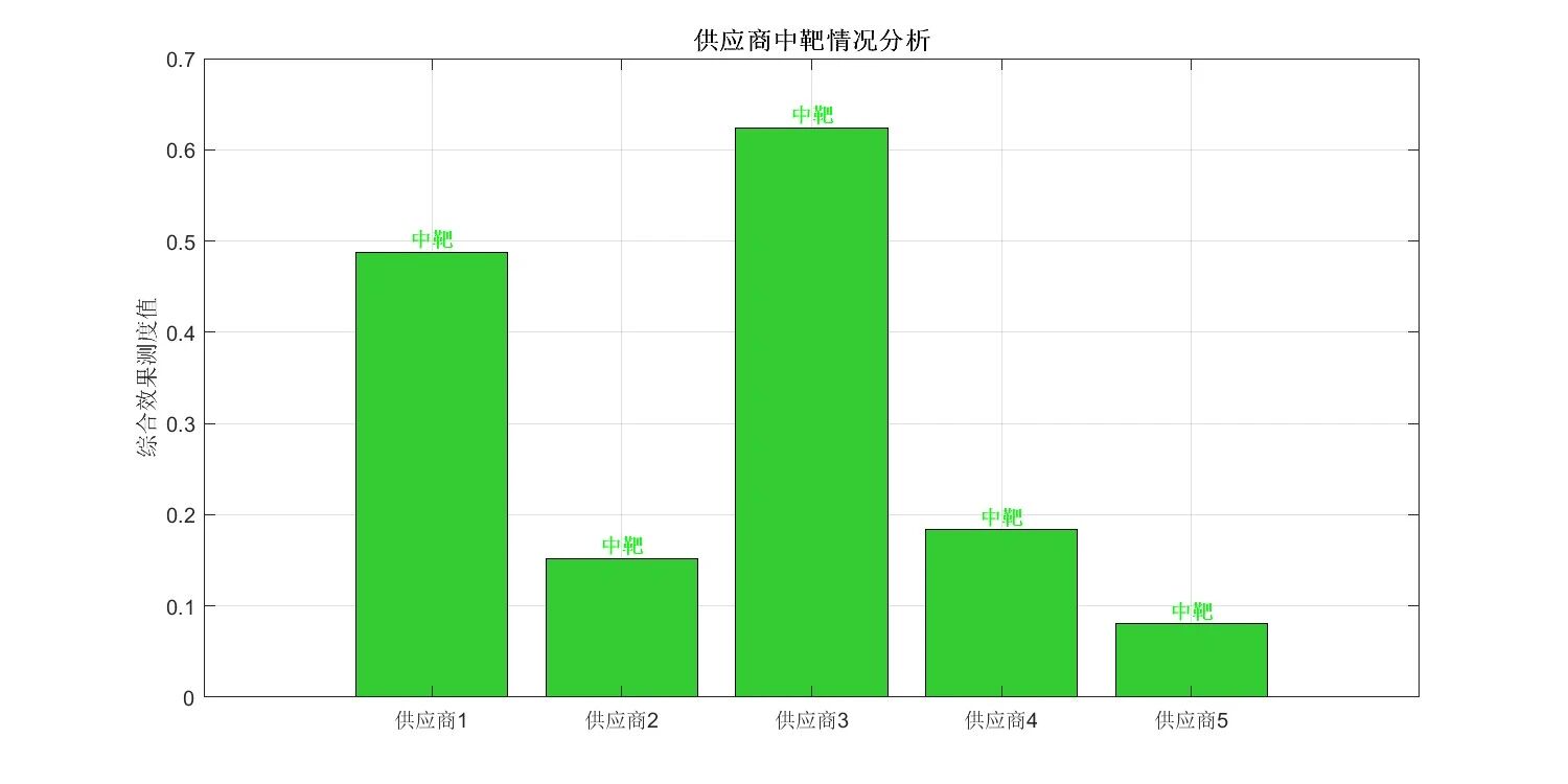- 决策结果直观性:通过 “靶心度”(方案与最优标准的贴近程度)量化各供应商的综合表现,靶心度越高,供应商越优,决策结果清晰易懂,便于采购部门执行。