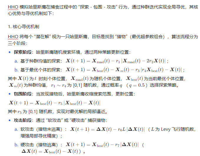 哈里斯鹰优化算法(Harris Hawks Optimization, HHO)是一种模拟哈里斯鹰捕食行为的新型群智能优化算法,具有 “寻优精度高、收敛速度快、鲁棒性强” 的优势,可有效解决超参数优化问题。本文将 HHO 与 TELM 结合,构建 “HHO-TELM 回归预测模型”,通过 HHO 自动寻优 TELM 的关键超参数,提升模型的非线性拟合能力与泛化性能,同时以 “工业锅炉出口温度预测” 为例验证其有效性,为复杂数据的回归预测提供高效解决方案。