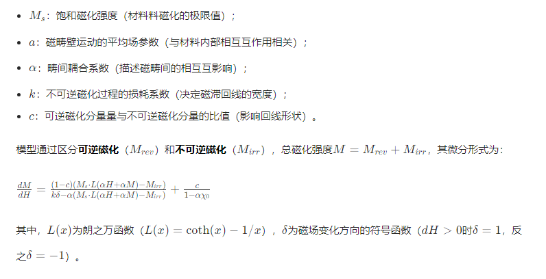 JA 模型基于磁畴壁运动的物理机制,用一组组微分方程描述磁化强度M与外加磁场H的非线性关系,核心参数包括 5 个物理量: