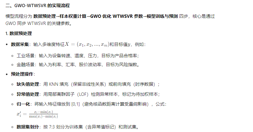 基于灰狼算法(GWO)优化加权孪生支持向量回归机(WTWSVR)的模型(GWO-WTWSVR),是通过 GWO 的群体智能优化能力,自适应 WTWSVR 中的核参数、惩罚系数及样本权重,增强模型对不平衡数据、非线性关系的拟合能力,尤其适用于含异常值或样本重要性差异显著的回归预测场景(如工业质量波动预测、金融风险评估)。以下是该模型的技术框架、实现流程及核心优势: