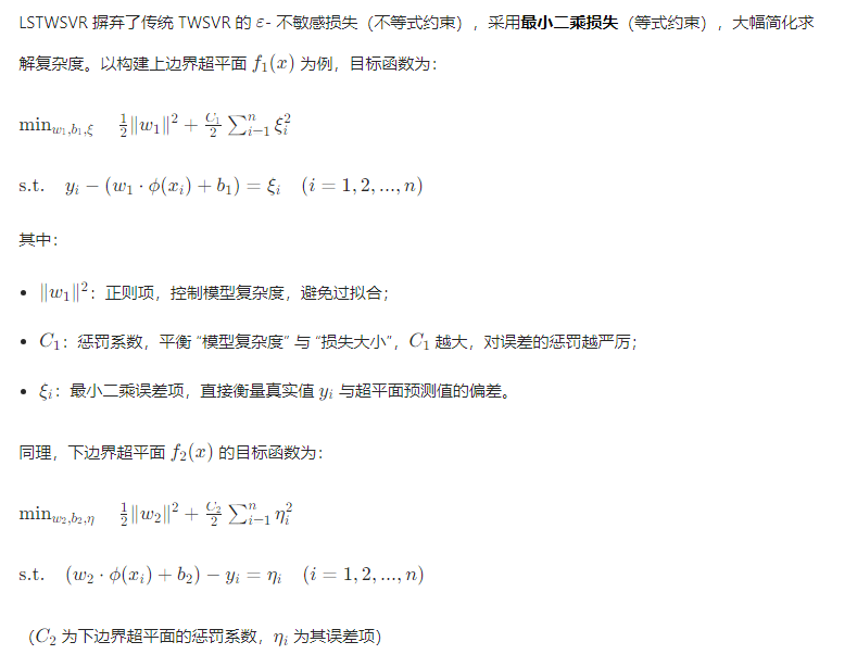 LSTWSVR 的核心思想是构建两个非平行超平面,使所有样本尽可能分布在两平面之间,预测值为两平面输出的平均值,同时通过最小二乘损失简化求解过程。