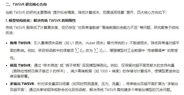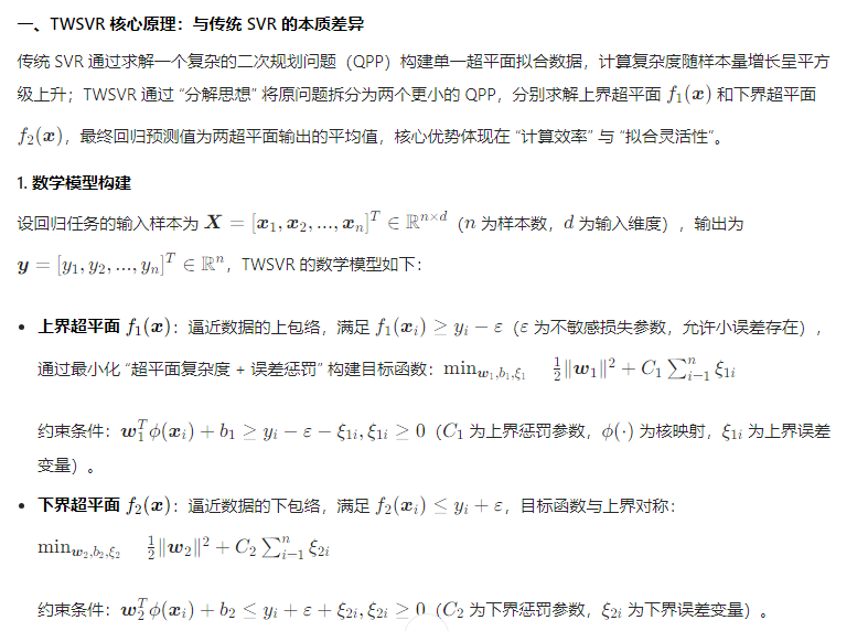 孪生支持向量机回归预测(TWSVR)是对传统支持向量回归(SVR)的重要改进,核心通过构建两个非平行超平面分别逼近数据的上、下界,大幅降低计算复杂度并提升非线性回归能力,尤其适合小样本、非线性的回归预测场景(如工业过程参数预测、能源负荷预测)。其研究重点集中在模型结构优化、核函数设计、参数寻优及工程应用拓展四大方向。