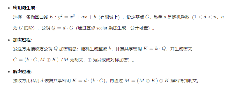 ECC 基于椭圆曲线数学特性实现加密,核心是 “椭圆曲线离散对数问题” 的计算复杂性(难以破解)。其密钥对生成与加密流程如下: