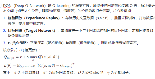 在自动驾驶场景中,路径规划需要同时满足三大核心需求:避障安全性(避开静态 / 动态障碍)、路径最优性(最短距离 / 最低能耗)、环境适应性(支持不同场景地图)。传统方法(如 A*、Dijkstra)依赖全局环境先验,面对动态或未知环境鲁棒性不足;而深度强化学习(DRL)通过神经网络拟合价值函数,无需环境模型,能自主学习避障与寻路策略。