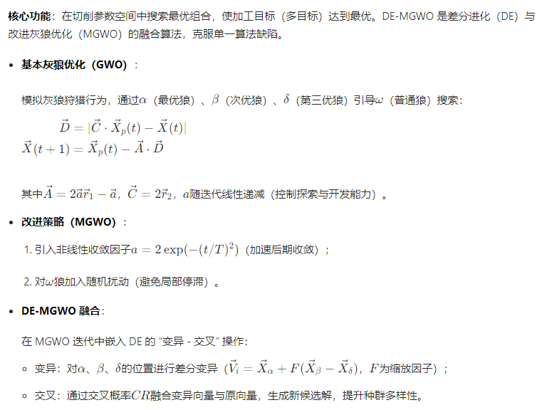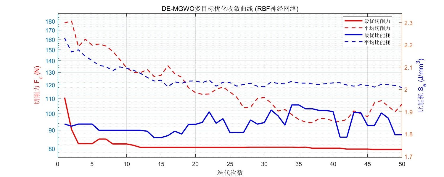 方法创新价值:将 RBF 神经网络(强非线性拟合能力)与 DE-MGWO(改进型智能优化算法,兼顾寻优精度与速度)结合,构建 “数据建模 - 智能寻优” 一体化框架,实现齿盘切削参数的精准、高效优化,为精密机械加工提供技术支撑。