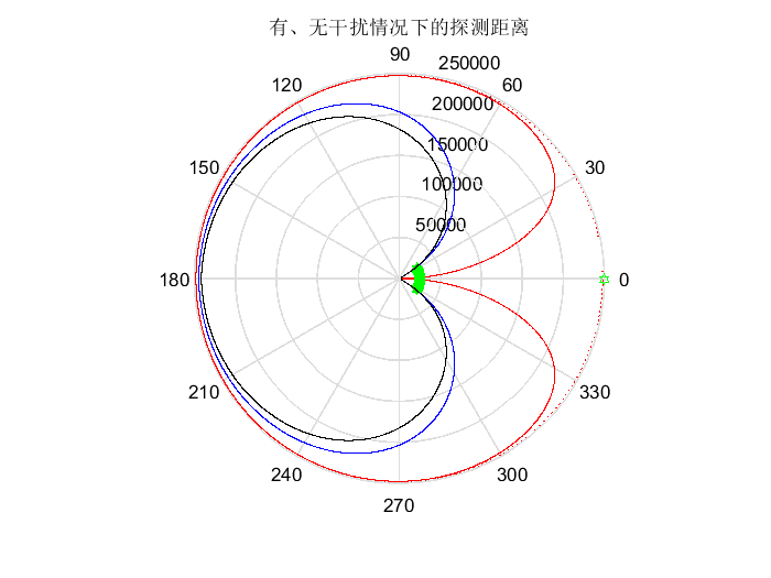 单部大功率干扰机场景:设定干扰机的位置(距离、角度)和功率,计算雷达在不同角度下的干扰功率与信噪比,进而得到受干扰后的最大作用距离