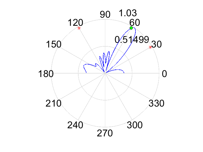 :极坐标波束图未归一化(未以最大增益为 0dB),无法清晰观察零陷深度与波束指向;图例位置遮挡信号。