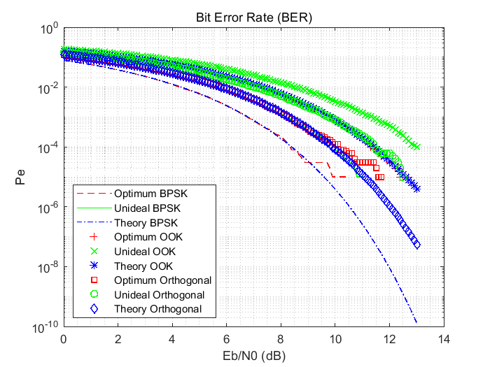 代码实现了 BPSK、OOK(幅移键控)和二进制正交调制 在 AWGN 信道下的误码率(BER)性能仿真,通过对比理想、非理想和理论曲线,分析三种调制方式的抗噪声能力。以下从核心功能、结果解读、关键问题与优化方向展开说明:
