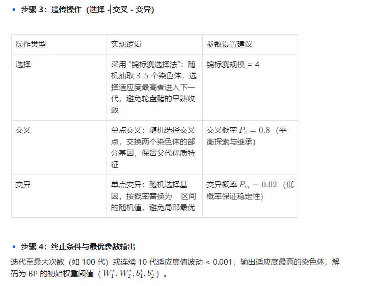 - GA-BP:通过遗传算法(GA)的 “选择 - 交叉 - 变异” 全局寻优,优化 BP 初始权重阈值,突破局部最优,提升非线性拟合精度;