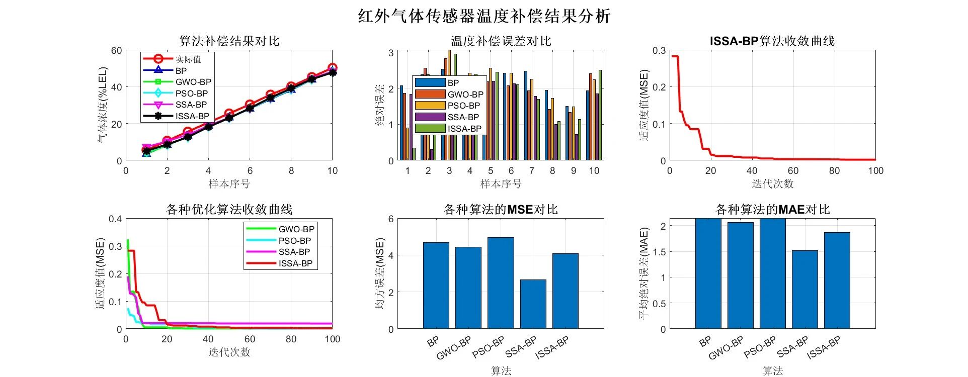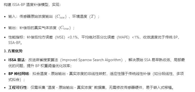 基于 ISSA-BP(改进麻雀搜索算法优化 BP 神经网络)的红外气体传感器温度补偿 完整方案,涵盖问题分析、算法改进、模型构建、仿真验证全流程,聚焦解决红外气体传感器受温度干扰导致的测量精度下降问题,兼顾理论创新性与工程实用性。