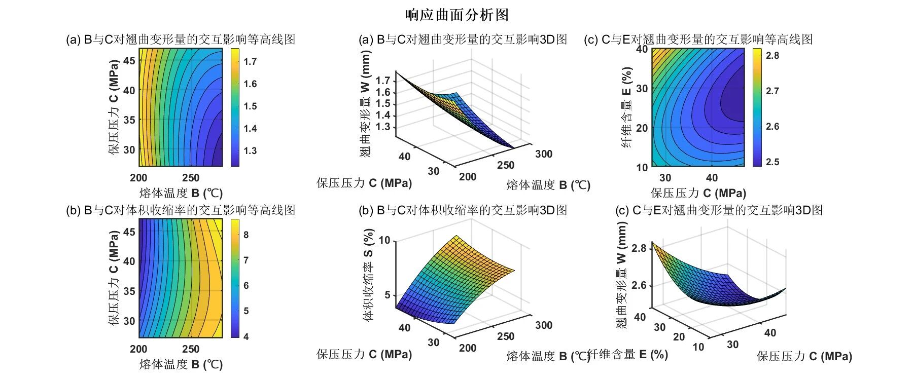 :采用 Box-Behnken 试验设计(BBD)生成小样本实验点,构建工艺参数与质量指标的二次响应面模型,精准拟合非线性关系,替代耗时的注塑实验 / 仿真;