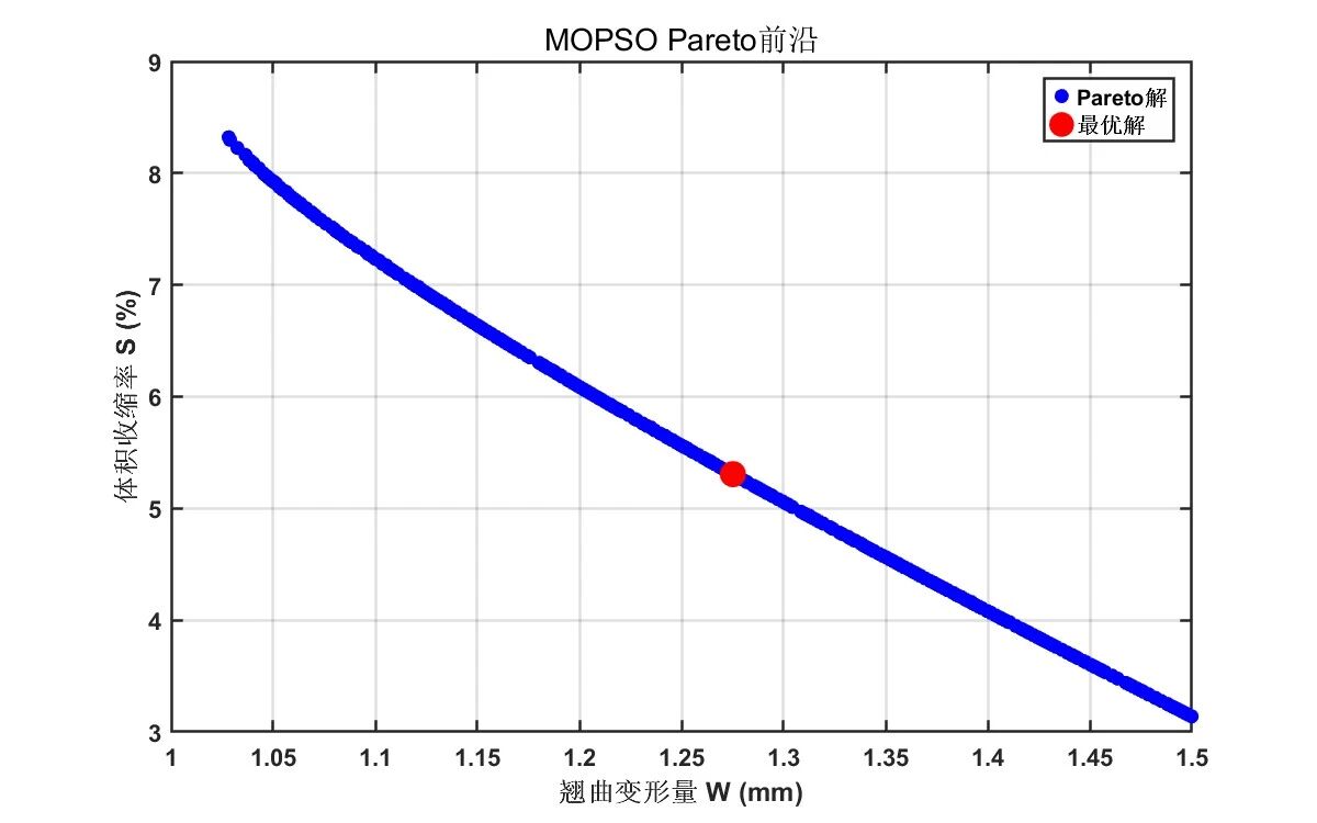 :以 RSM 模型为适应度函数,通过多目标粒子群算法搜索 “拉伸强度最大化、体积收缩率最小化、翘曲变形量最小化” 的帕累托最优解,同时维护外部存档保留均匀的非支配解;
