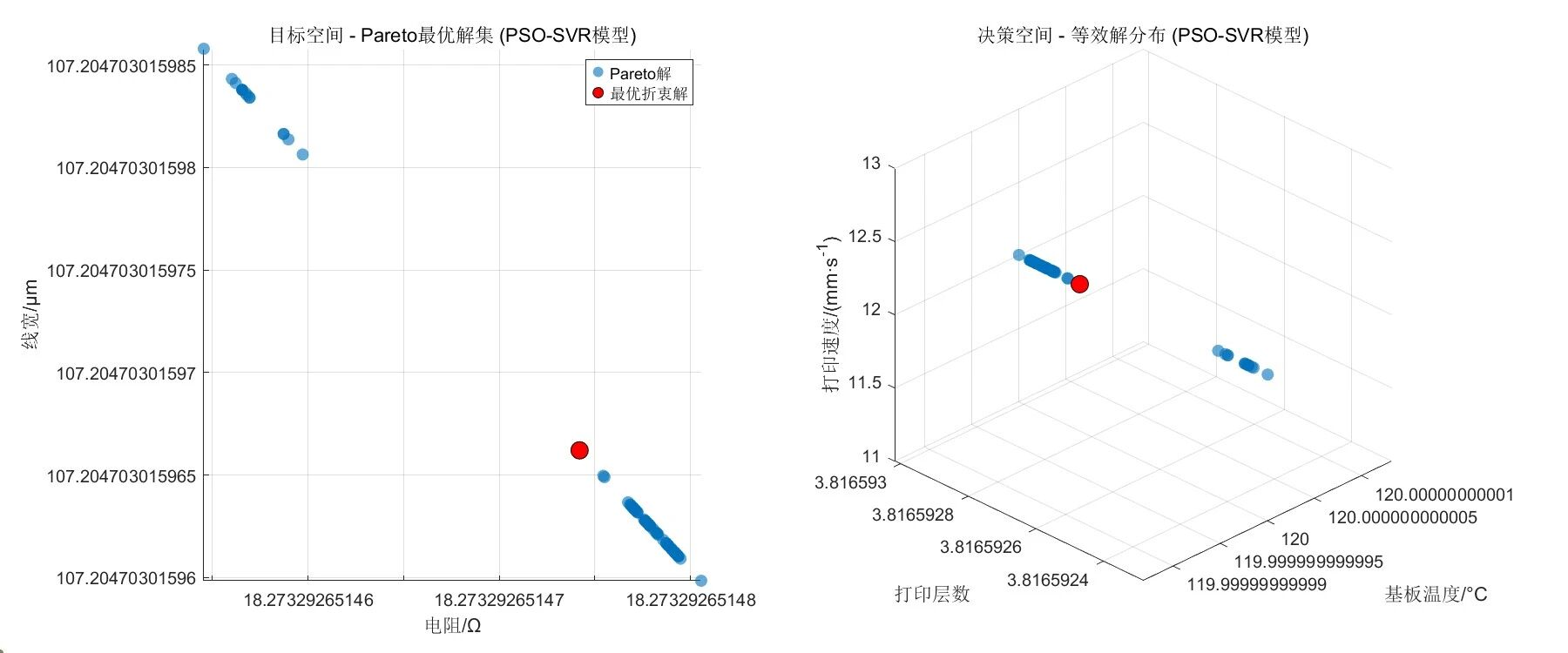 喷墨打印纳米银导线存在工艺参数耦合强、质量指标非线性显著、多模态最优解(不同参数组合可达相似优性能)、多目标冲突(线宽均匀性 - 电阻率 - 附着力)、实验样本稀缺的痛点,本方案通过 “PSO-SVR 高精度预测 + MMOPs 多模态寻优” 的融合思路解决: