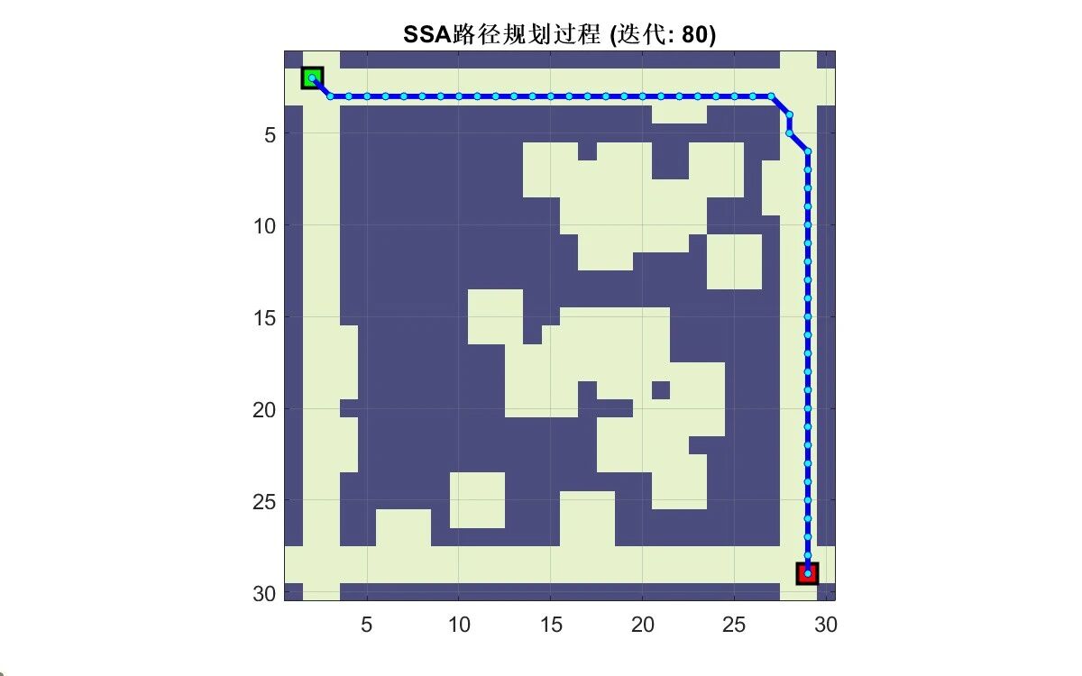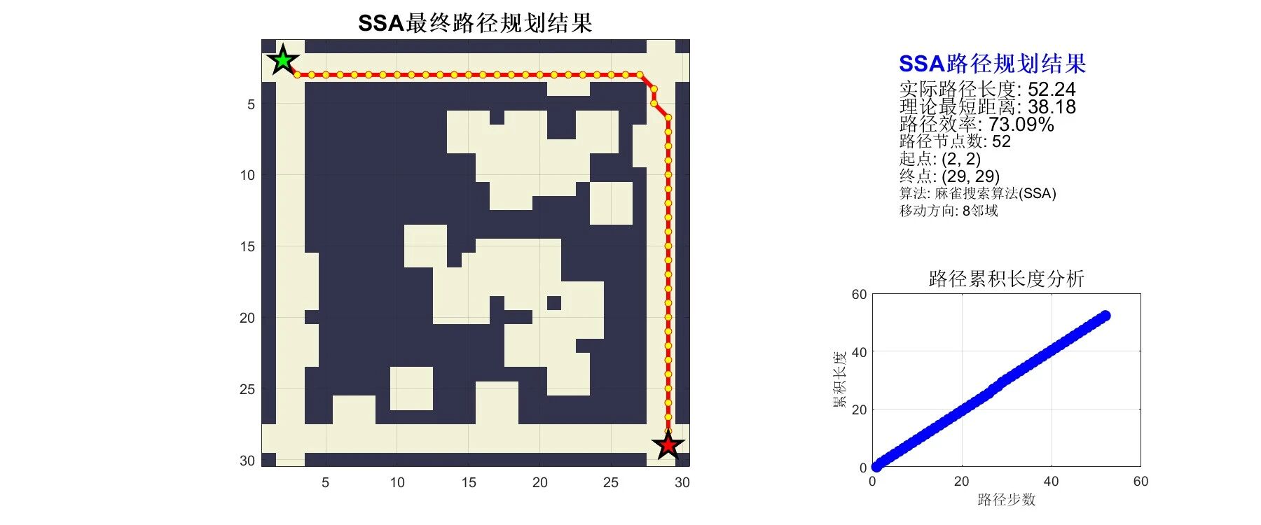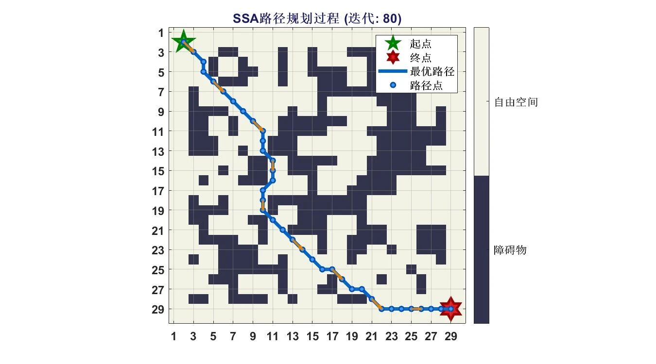 麻雀搜索算法(Sparrow Search Algorithm, SSA)模拟麻雀种群的觅食行为(生产者 - 追随者机制) 和反捕食行为(警戒者机制),在栅格地图中实现路径规划: