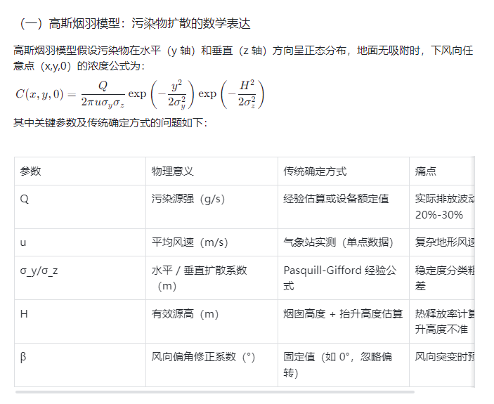 在大气污染预测、化工泄漏应急模拟、区域空气质量评估等场景中,高斯烟羽模型是最经典的扩散预测工具 —— 它基于 “污染物在均匀稳定大气中呈高斯分布” 的假设,计算不同位置的污染物浓度,为环保决策提供依据。但传统高斯烟羽模型存在致命短板:核心参数依赖经验公式,复杂场景下误差显著。