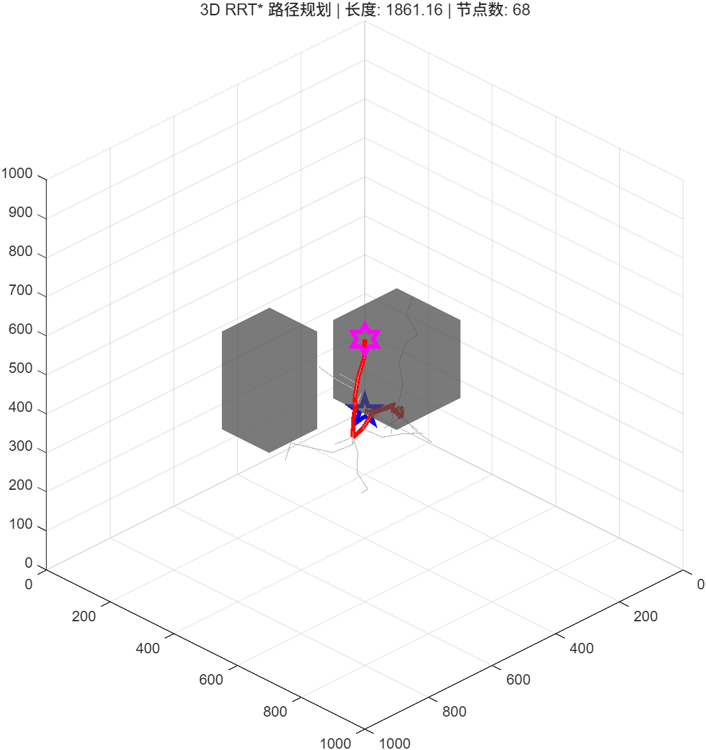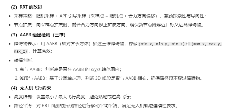 人工势场(APF)+ RRT + AABB 碰撞检测 的无人机三维路径规划完整实现,核心是融合 APF 的目标导向性与 RRT 的概率完备性,通过 AABB(轴对齐包围盒)实现高效三维碰撞检测,解决无人机在复杂三维环境中的避障与路径寻优问题