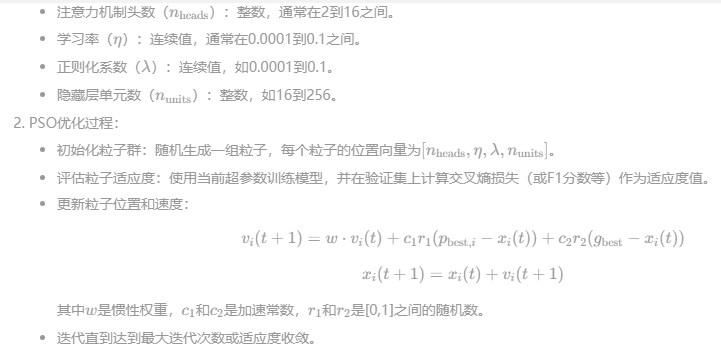粒子群优化(PSO):PSO是一种群体智能优化算法,用于搜索最优超参数组合。每个粒子代表一组超参数(注意力头数、学习率、正则化系数、隐藏层单元数),通过迭代更新粒子的位置(即超参数值)来最小化损失函数(如交叉熵)。