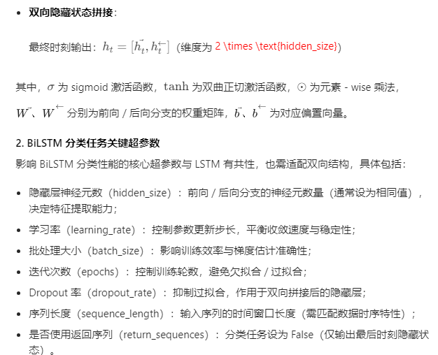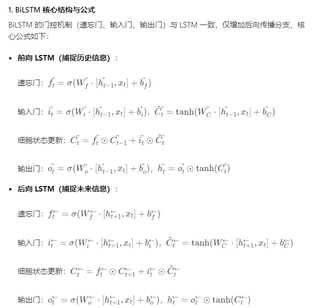 BiLSTM 是 LSTM 的扩展形式,核心创新在于引入双向传播机制—— 在网络中并行设置前向 LSTM(Forward LSTM)和后向 LSTM(Backward LSTM),分别处理序列的 “过去→现在” 和 “未来→现在” 信息,最终将双向隐藏状态拼接作为输出,从而完整捕捉序列的双向时序依赖。