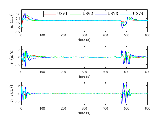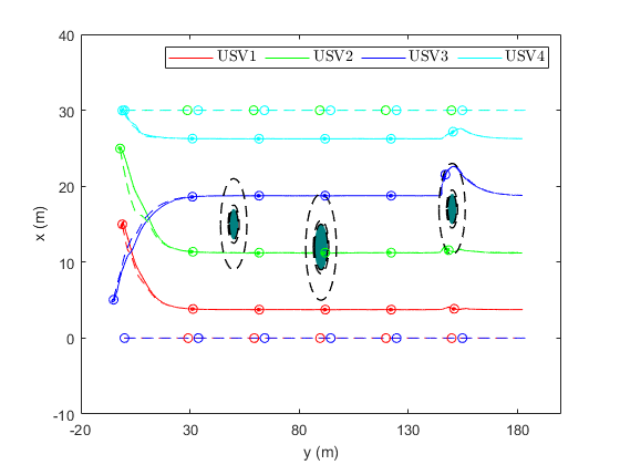 - 队形保持与包容控制:确保 4 艘 USV 在任务执行中(如矩形、菱形队形),跟随者始终处于领航员的 “包容集” 内,且适应欠驱动船舶 “仅可控前进(surge)、转向(yaw),横移(sway)弱可控” 的动力学约束;