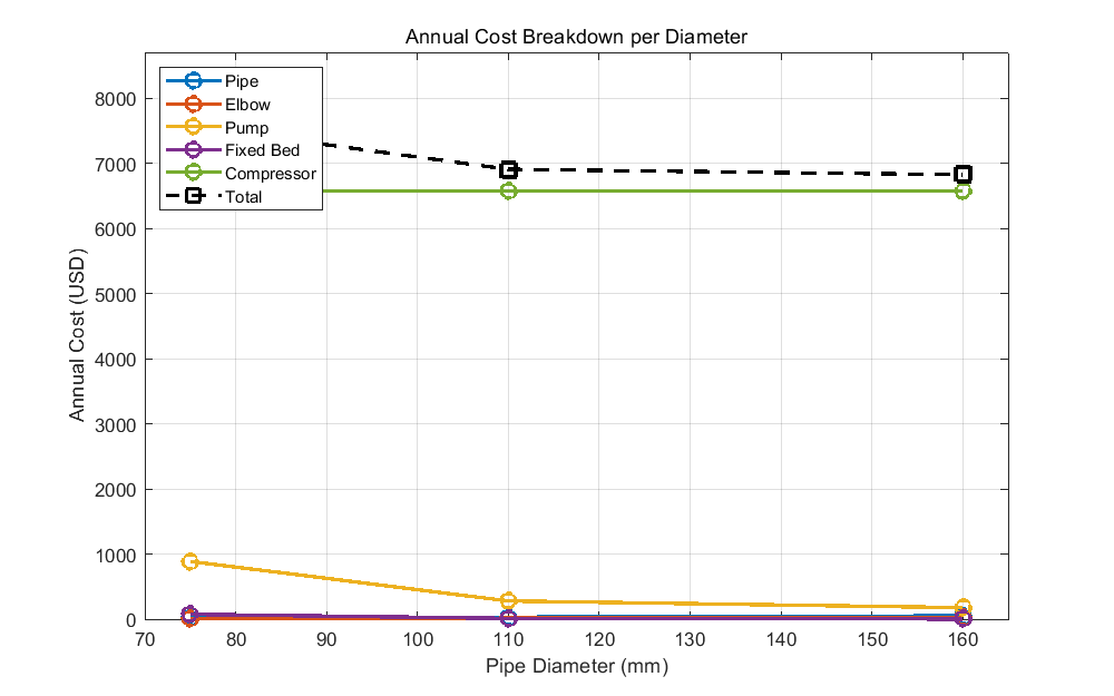 系统中安装了 5 个 90 度弯管,同时使用了固定床塔。塔内填充材料的直径为 15 毫米,空隙率为 0.4。总电费按 0.10 美元 / 千瓦时(kWh)计算。为确定能实现最高效、最低成本输送流程的管道,工作人员对三种不同直径的管道进行了计算分析。