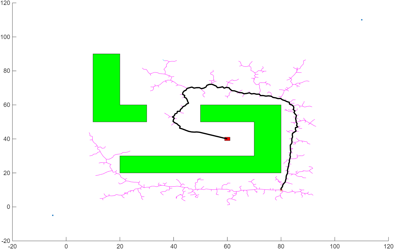 针对本文“含多边形障碍物+红色矩形目标区域”的需求,需对标准RRT算法进行两处关键适配: 1. 目标区域判定:将“单点到达目标”改为“节点进入红色矩形区域即可终止”,需定义矩形区域的坐标范围(如左上角(x1,y1)、右下角(x2,y2)),判断新节点坐标是否落在该范围内; 2. 碰撞检测适配:针对多边形障碍物的几何特性,采用“线段-多边形相交检测”方法,判断扩展路径是否与障碍物边界冲突。