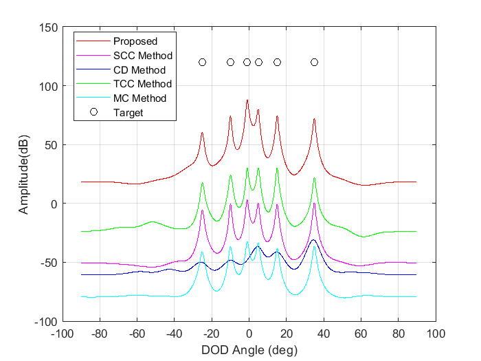 其中,X(t) ∈ C^(N×T)为接收信号矩阵(T为快拍数),A_r = [a_r(θ₁), a_r(θ₂), ..., a_r(θ_K)] ∈ C^(N×K)为接收导向矩阵,S(φ) ∈ C^(M×T)为发射信号矩阵,Λ = diag(α₁, α₂, ..., α_K) ∈ C^(K×K)为目标散射系数矩阵,A_t = [a_t(φ₁), a_t(φ₂), ..., a_t(φ_K)] ∈ C^(M×K)为发射导向矩阵,N(t) ∈ C^(N×T)为有色噪声矩阵,H表示共轭转置。