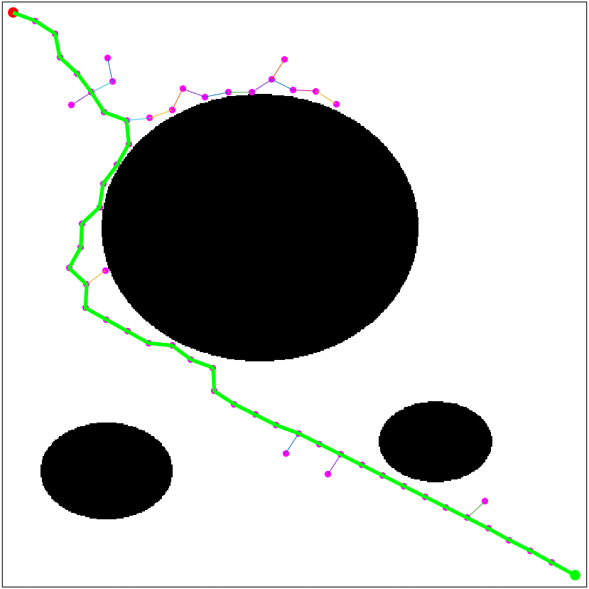 基础RRT算法的局限性较为明显:一是规划路径不最优,由于随机采样的随机性,规划出的路径通常较为曲折,无法保证最短路径;二是规划效率较低,单方向树扩展易出现“盲目搜索”,尤其在大空间或障碍物密集环境中无效采样占比高;三是对动态障碍物适应性差,难以快速响应环境变化。