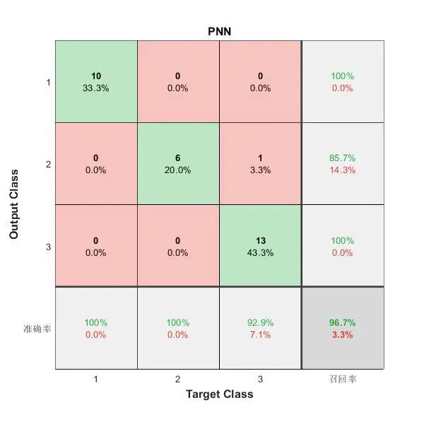 概率神经网络(PNN)源于贝叶斯决策理论,是一种径向基函数神经网络,核心优势在于训练速度快、分类精度高、对噪声数据具有较强的容错性,适用于模式识别与分类任务。PNN的网络结构分为四层:1. 输入层:接收待分类样本的特征向量,神经元数量等于特征维度;2. 模式层:采用径向基函数(常用高斯函数)作为激活函数,每个神经元对应一个训练样本,计算输入样本与训练样本的相似度;3. 求和层:按类别对模式层输出结果求和,得到每个类别的概率密度估计;4. 输出层:通过竞争学习选择概率密度最大的类别作为分类结果。