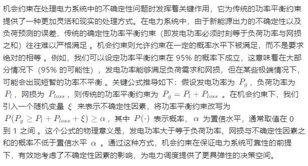 条件风险价值(CVaR)作为一种先进的风险度量工具,在量化极端风险方面具有独特的优势,它能够更全面地反映电力系统在极端情况下的风险状况 。CVaR 的计算方式是在给定置信水平下,计算投资组合损失超过 VaR(风险价值)的条件期望值 。例如,若某电力系统在 95% 置信水平下的 VaR 为一定值,意味着有 5% 的概率损失超过该值;而 CVaR 则进一步回答 “当损失超过该值时,平均损失是多少” 。在电力系统模型中,我们将 CVaR 应用于评估新能源出力不确定性带来的极端风险,具体步骤如下:首先,根据历史数据或预测模型,确定新能源出力的可能场景集合 。对于每个场景,计算电力系统的运行成本或其他风险指标 。然后,按照运行成本从小到大对这些场景进行排序,找到对应置信水平(如 95%)的分位数,即 VaR 值 。计算超过 VaR 值的那些场景的平均运行成本,这个平均值就是 CVaR 值 。通过将 CVaR 纳入电力调度模型的目标函数或约束条件中,可以有效地控制电力系统在极端情况下的风险,确保系统在面对不确定性时的安全性和稳定性 。例如,在目标函数中增加 CVaR 项,使得调度决策在追求经济性的同时,也能充分考虑到极端风险,避免因极端情况导致的系统崩溃或重大损失 。