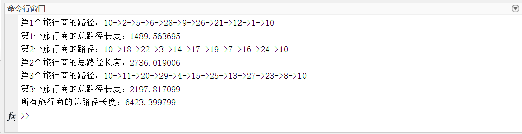 fprintf('第%d个旅行商的总路径长度:%f\n',i,Dis(i));