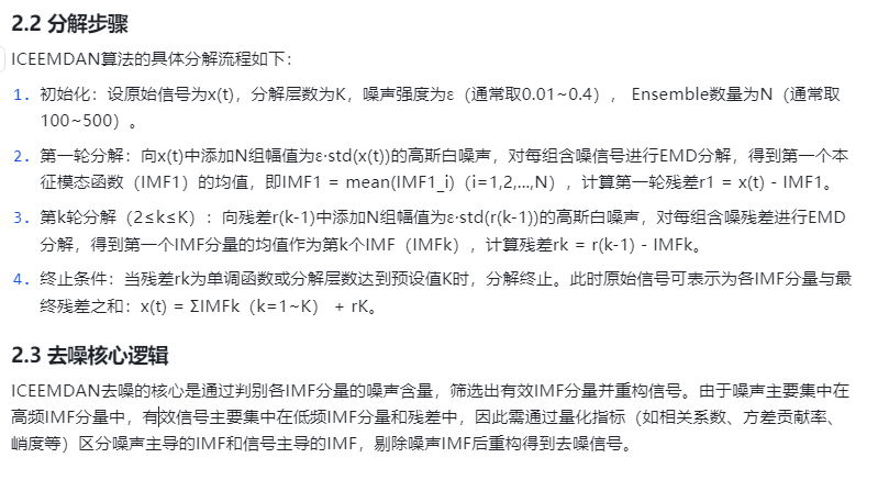 ICEEMDAN(Improved Complete Ensemble Empirical Mode Decomposition with Adaptive Noise)算法是在EEMD(集合经验模态分解)、CEEMD(完备集合经验模态分解)基础上改进的自适应信号分解算法,核心优势在于通过添加自适应噪声和多轮迭代分解,解决了传统EMD算法的模态混叠问题,同时提升了分解效率和精度。