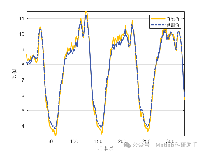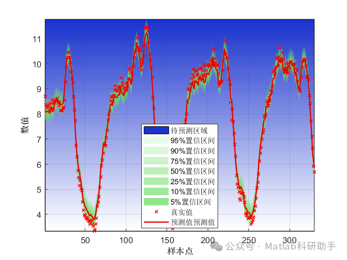置信区间计算: 根据残差的概率密度函数,计算不同置信水平(例如90%,95%,99%)下的预测区间。例如,对于95%置信区间,我们需要找到概率密度函数积分值为0.95的两个分位点,这两个分位点与LSTM的点预测值之和即为预测区间的上下界。