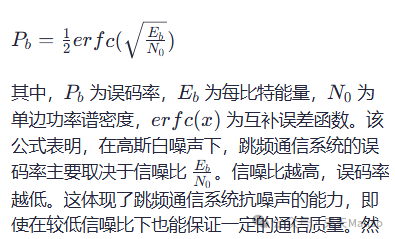 在实际应用中,跳频通信系统往往同时面临高斯白噪声和多用户干扰的影响。这两种干扰的叠加效应会进一步恶化系统的性能,导致误码率显著上升。在这种情况下,误码率的计算更加复杂,通常需要采用数值仿真或近似分析方法。