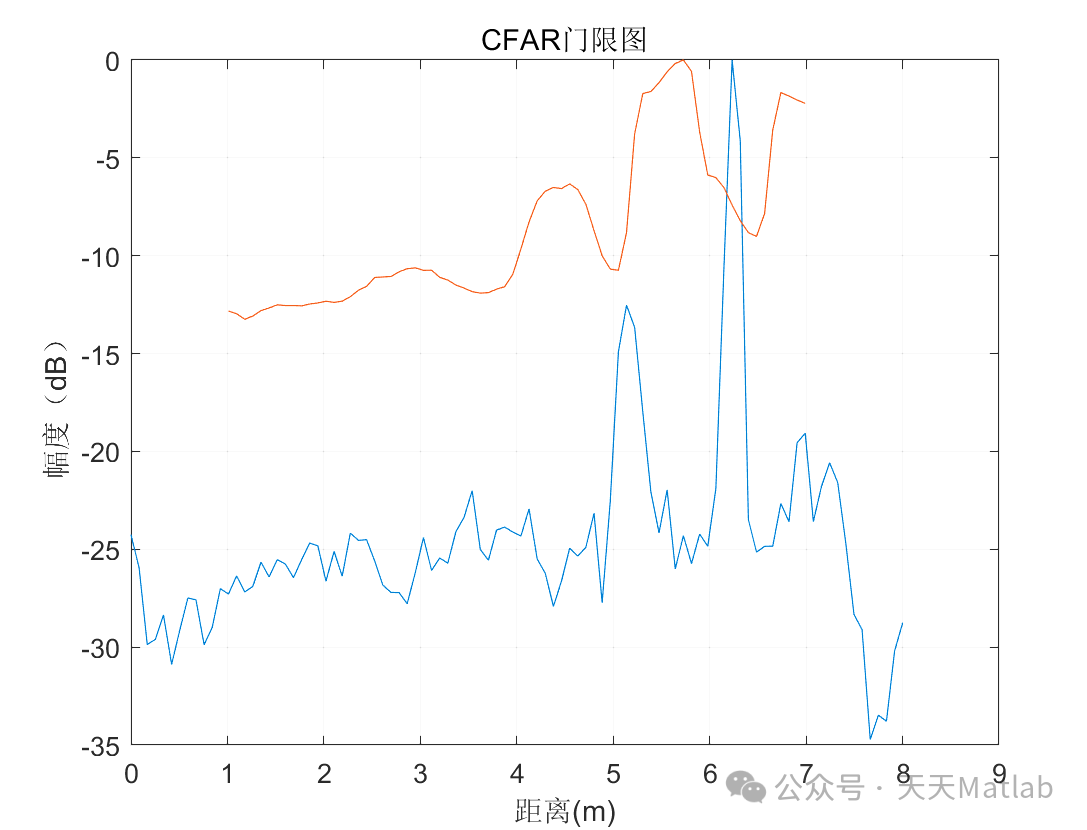 threshold = mean(DopplerSpectrum(guardCells+1:guardCells+trainCells)) * CFAR_Factor; % 计算阈值, CFAR_Factor为门限系数