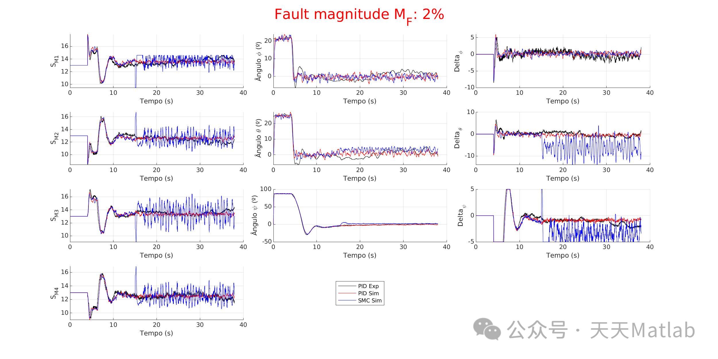 本文研究的是单推进器失效的情况。假设推进器 f1 失效,即 f1 的输出为零。在这种情况下,四轴飞行器将失去一个方向上的推力,从而导致姿态失控。失效的推进器不再提供推力,会直接影响到飞行器的推力分配和力矩控制。在这种情况下,控制系统的设计必须考虑到故障的影响,并采取相应的措施来补偿故障带来的偏差。